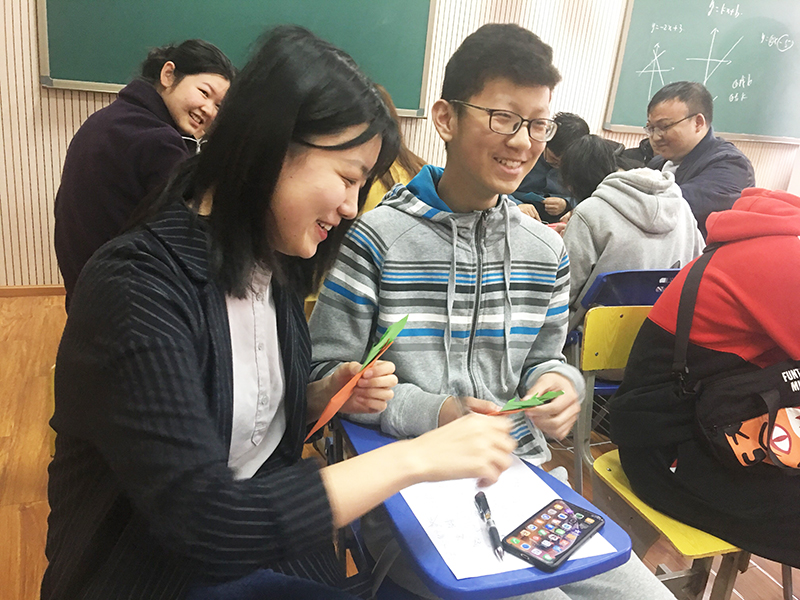 志愿者與同學(xué)們一對(duì)一結(jié)伴并通過(guò)紙筆相互交流,手把手教這些孩子們做折紙,青蛙、兔子、胡蘿卜、大象、揚(yáng)帆遠(yuǎn)航號(hào)……這些可愛(ài)的折紙作品唯妙唯俏;“你演我猜”游戲更是將歡樂(lè)的氛圍推向了高潮,在聾生們的生動(dòng)演繹和志愿者們的默契配合下,高手層出不窮,全程笑點(diǎn)不斷。