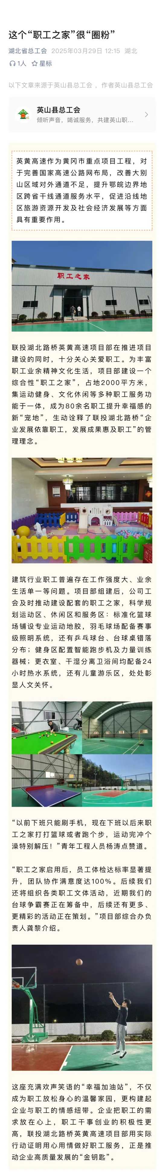 聯(lián)投湖北路橋英黃高速項目部在推進項目建設(shè)的同時,十分關(guān)心關(guān)愛職工。為豐富職工業(yè)余精神文化生活,項目部建設(shè)一個綜合性“職工之家”,占地2000平方米,集運動健身、文化休閑等多種職工服務(wù)功能于一體,成為80余名職工提升幸福感的新“寵地”,生動詮釋了聯(lián)投湖北路橋“企業(yè)發(fā)展依靠職工,發(fā)展成果惠及職工”的管理理念。近日,湖北省總工會進行深入報道,全文如下: