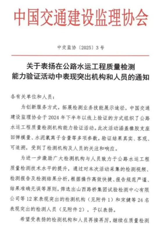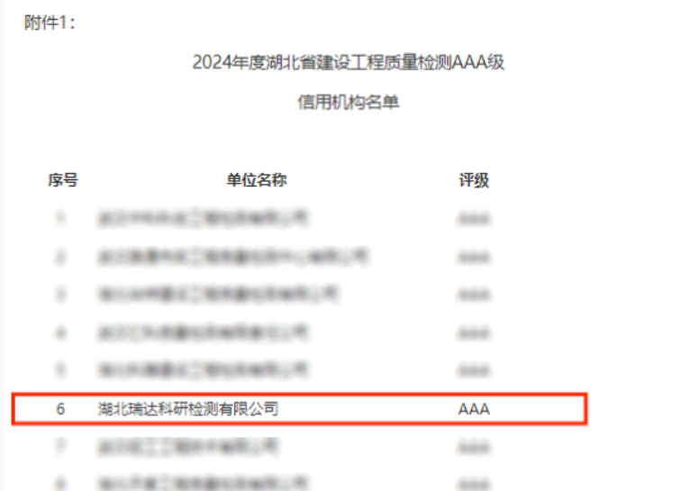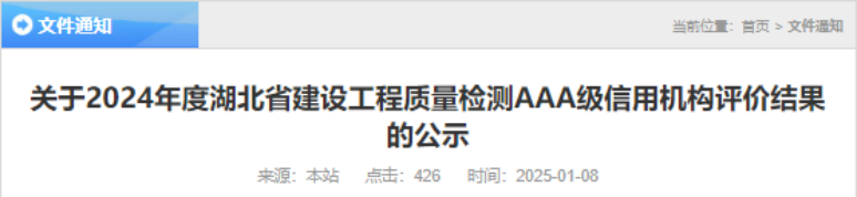 1月8日,湖北省建設(shè)工程質(zhì)量安全協(xié)會發(fā)布了2024年度湖北省建設(shè)工程質(zhì)量檢測AAA級信用機構(gòu)評價結(jié)果,聯(lián)投湖北路橋瑞達科研檢測公司憑借優(yōu)異的誠信建設(shè)和信用管理能力,榮獲最高級“AAA級”信用機構(gòu)評價。