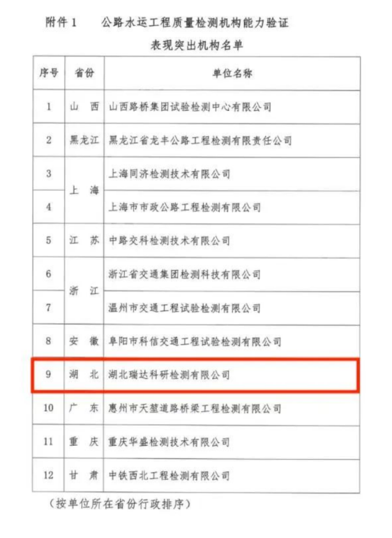 1月9日,中國交通建設(shè)監(jiān)理協(xié)會發(fā)布表彰通知,聯(lián)投湖北路橋瑞達科研檢測公司成功蟬聯(lián)第二屆公路水運工程質(zhì)量檢測能力驗證“表現(xiàn)突出機構(gòu)”榮譽。成為全省唯一一家連續(xù)兩屆獲此榮譽的檢測機構(gòu)。