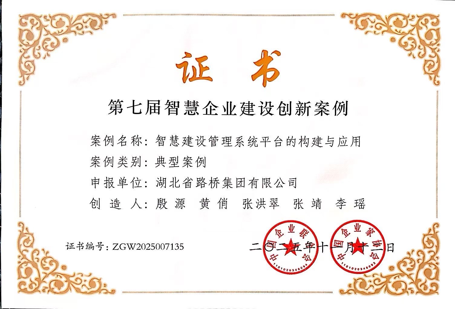 近日,中國企業(yè)聯(lián)合會公布了“第七屆智慧企業(yè)建設(shè)創(chuàng)新案例”入選名單,湖北路橋申報的《智慧建設(shè)管理系統(tǒng)平臺的構(gòu)建與應(yīng)用》從全國420項案例中脫穎而出,成功入選。