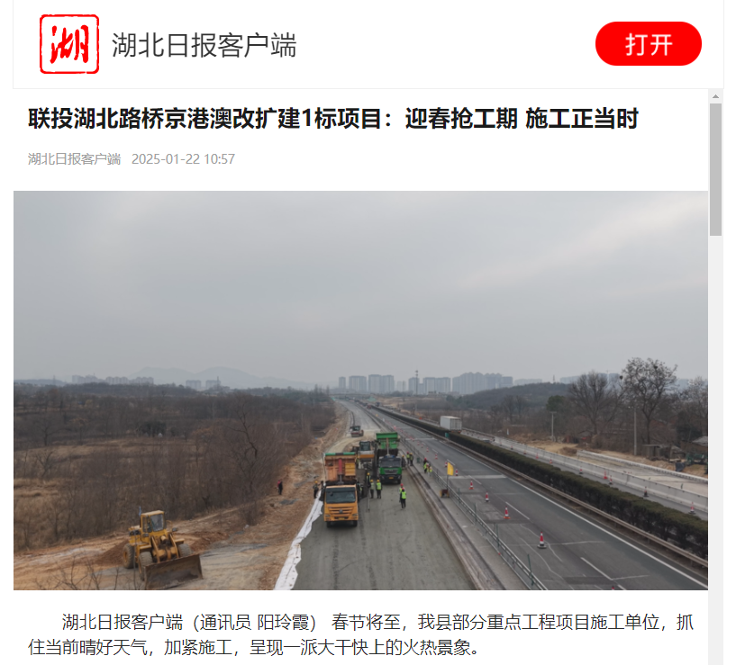 媒體聚焦 | 聯(lián)投湖北路橋京港澳改擴建1標項目:迎春搶工期,施工正當時