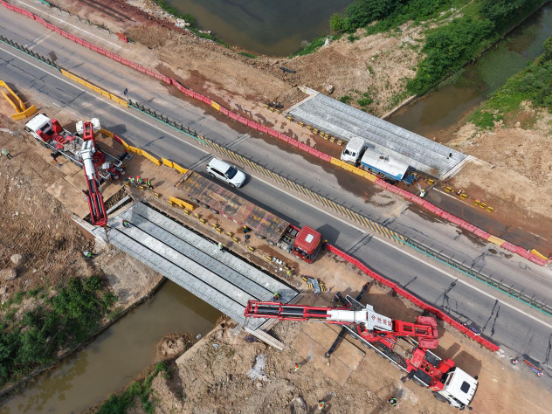 面對施工場地限制、高壓線路影響、邊通車邊施工等復雜難題,施工單位湖北省路橋集團有限公司通過精密設計演算,創(chuàng)新性提出采用85t折臂吊車方案,通過減少吊車配重、壓縮車輛轉(zhuǎn)幅半徑,既滿足現(xiàn)場實際施工需求,又顯著提高了吊裝作業(yè)的安全性能與機動性。同時,該公司成立技術、安全、施工專項工作組,聯(lián)合建設單位、監(jiān)理單位構(gòu)建“三位一體”安全管控體系,安排專人配合公安交管部門引導交通,全過程保障碧石港橋、瑪瑙嘴橋拼寬段32片空心板吊裝作業(yè)安全。