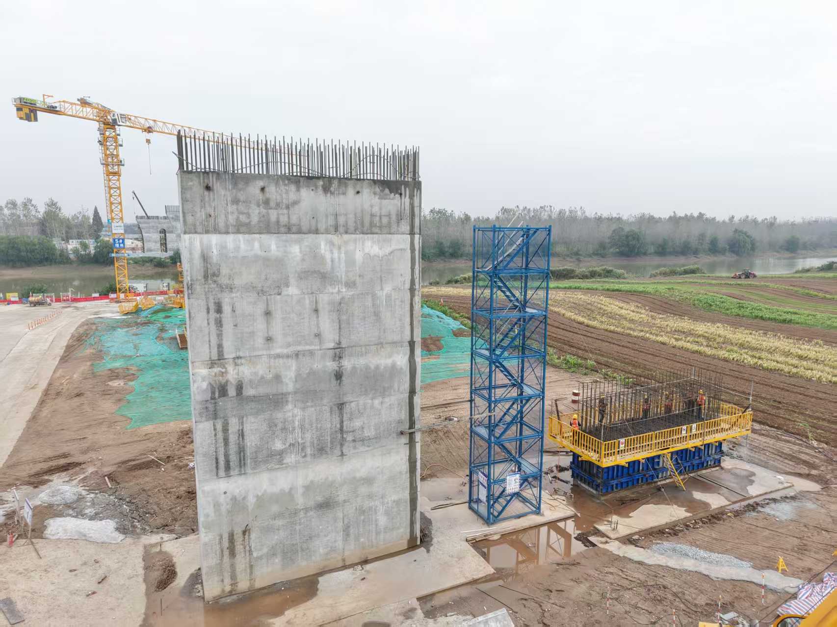 本次封頂?shù)?/span>4#過渡墩是連接松虎河引橋與主橋的關(guān)鍵墩位,采用分離式矩形實(shí)體墩設(shè)計(jì),具有結(jié)構(gòu)穩(wěn)定、承載能力強(qiáng)的特點(diǎn)。墩身橫橋向?qū)?米、順橋向?qū)?.2米,采用C40高性能混凝土現(xiàn)澆工藝,澆筑方量達(dá)317.1立方米。為保障混凝土強(qiáng)度與耐久性,施工完成后立即啟動(dòng)定時(shí)自動(dòng)噴淋養(yǎng)生系統(tǒng),通過智能控制濕度與頻次,有效預(yù)防混凝土表面裂縫,確保墩身結(jié)構(gòu)質(zhì)量。