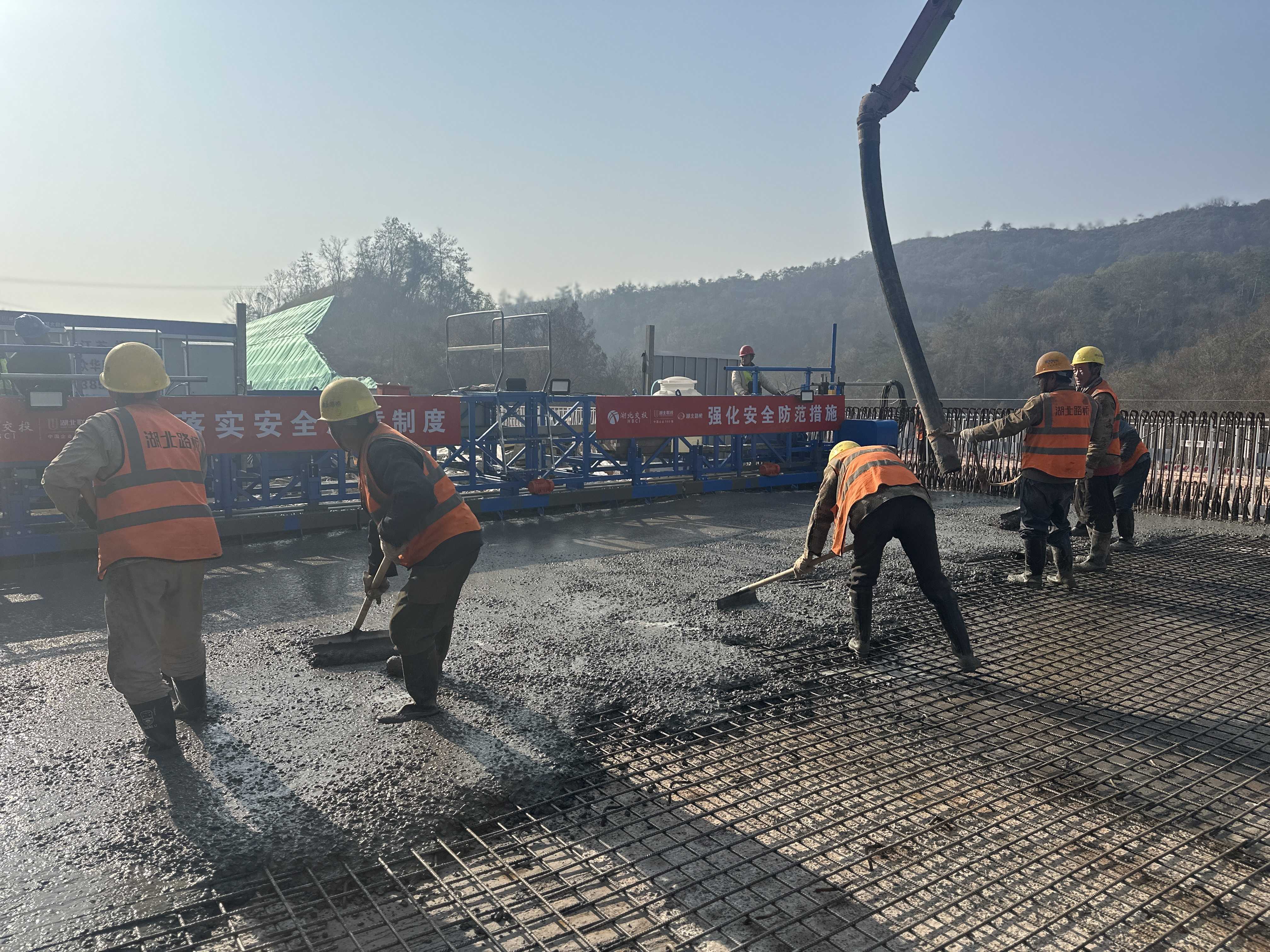 襄宜高速作為區(qū)域交通網(wǎng)重要組成部分,建成后將有效改善沿線交通條件,促進宜昌與襄陽兩地經(jīng)濟聯(lián)動,為鄂西地區(qū)高質(zhì)量發(fā)展提供有力支撐。其中,襄宜三標全長17.2千米,包含路基、橋梁、互通等多項工程,本次完成的首聯(lián)橋面鋪裝位于駐馬溪大橋左幅,采用一聯(lián)整體澆筑方式施工,鋪裝層采用C50混凝土作為調(diào)平層,厚度為8厘米,鋪裝長度達127米,寬度為11.5米。