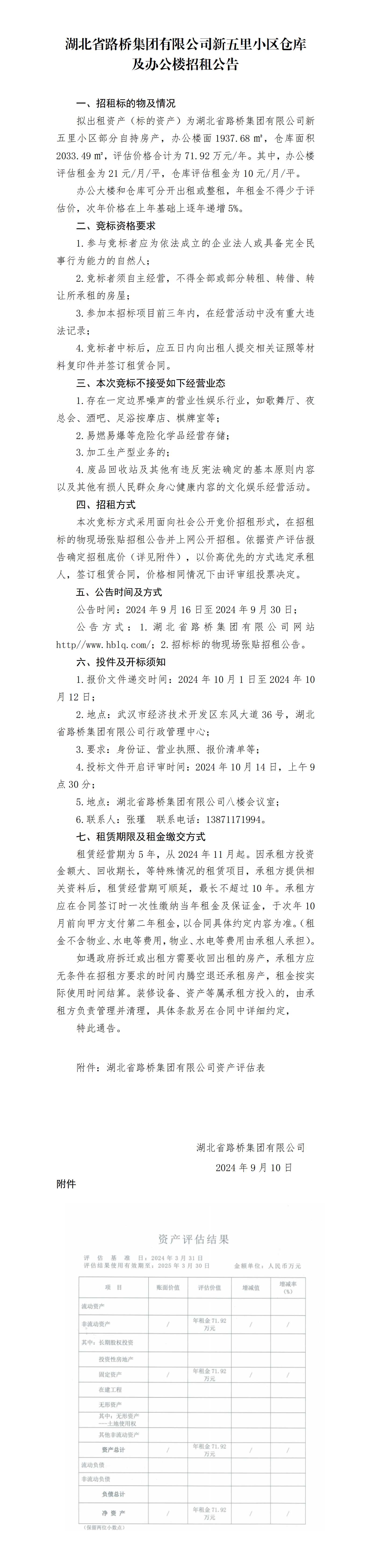 湖北省路橋集團有限公司新五里小區(qū)倉庫及辦公樓招租公告